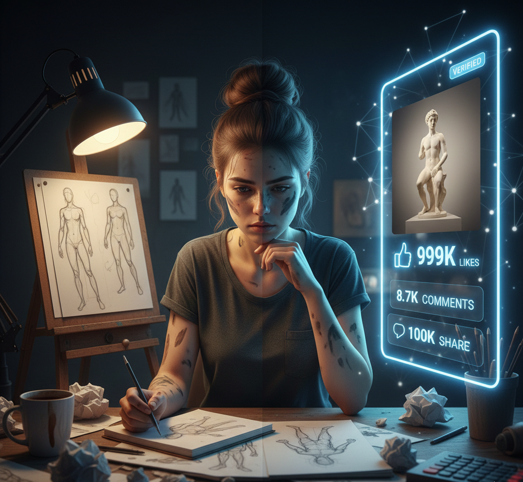 The pressure to get “likes” and go “viral” forces artists to conform to trends and algorithmic preferences. When you chase the algorithm, you push your authentic, singular vision aside. Your self-worth becomes linked to unpredictable, non-artistic factors, causing emotional instability and potentially leading to a homogenization of your art style.