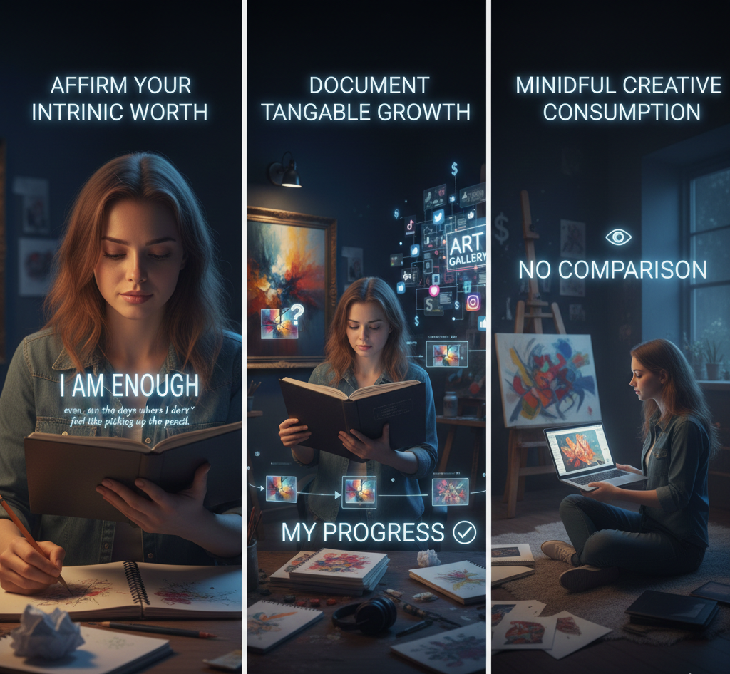 Social media is built for “upward comparison.” You compare your messy, iterative, private creative process—the failed sketches, the discarded ideas—to another artist’s monetized, perfectly edited, final product showcased online. This gap is impossible to bridge and inevitably fuels the belief that you are inadequate.